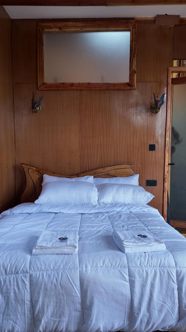 Towels and bed linen are featured in the lodge.