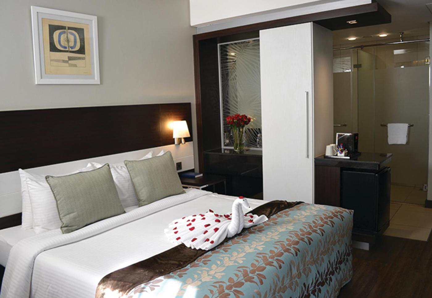 Executive Suite. This spacious, air-conditioned room is elegantly decorated and includes a seating and working area, flat-screen TV, minibar, tea-and-coffee making facilities and safety deposit box. There are views of the swimming pool and lush gardens. The modern bathroom has a bath tub and a rain shower. This room also comes with a free handy phone for free local and selected international calls. ;
